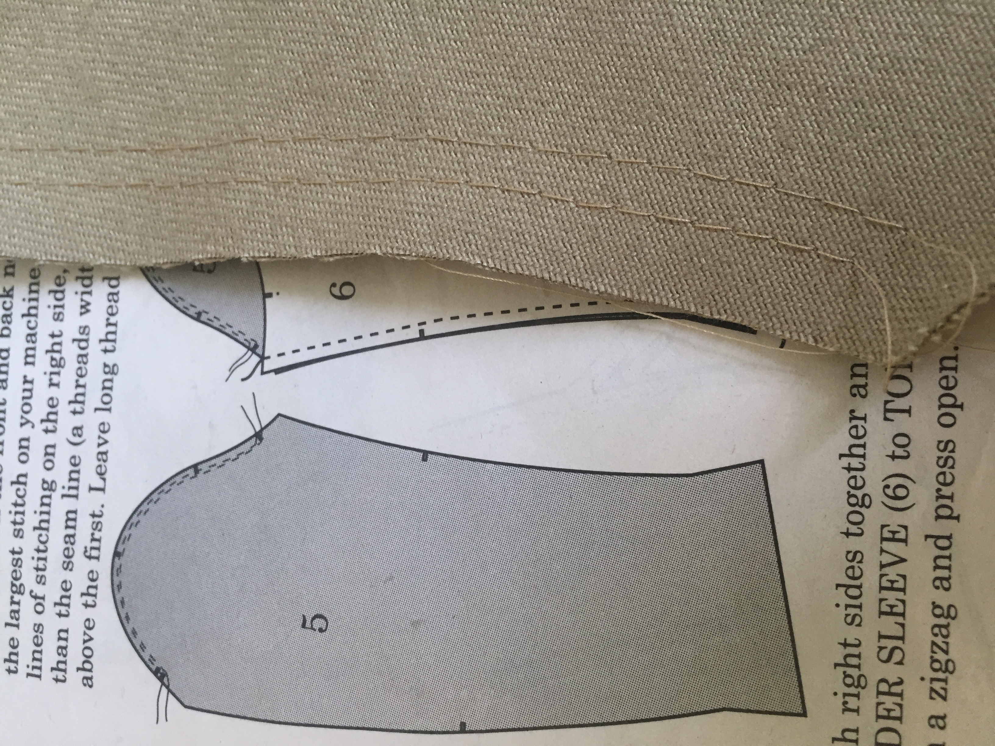This is where the ease stitching mentioned last week comes in. When the arm piece is to be set into the arm hole, the circumference of the arm is greater than the circumference of the hole and needs to be shrunk a little. Not a lot, but you want the shrink to be evenly distributed, not all in one big bump. I did link to a video that showed how it worked and I did use the technique showed there. Only, it didn’t work for me. It may have been the thickness of the fabric, or maybe the steps in the stitching, but I ended up doing the ease stitching by hand, and there wasn’t that much that needed adjusting, so the end result turned out ok.
