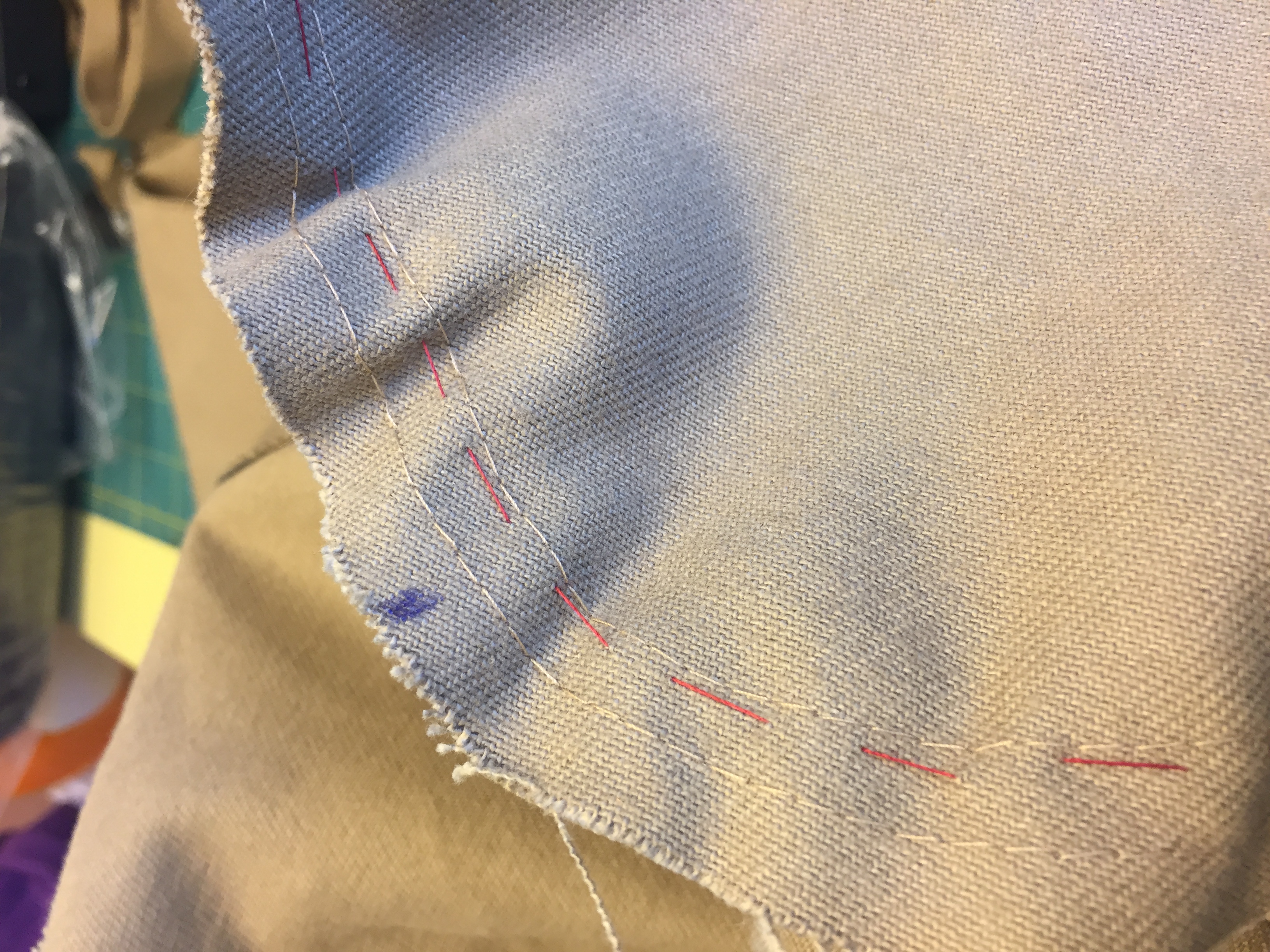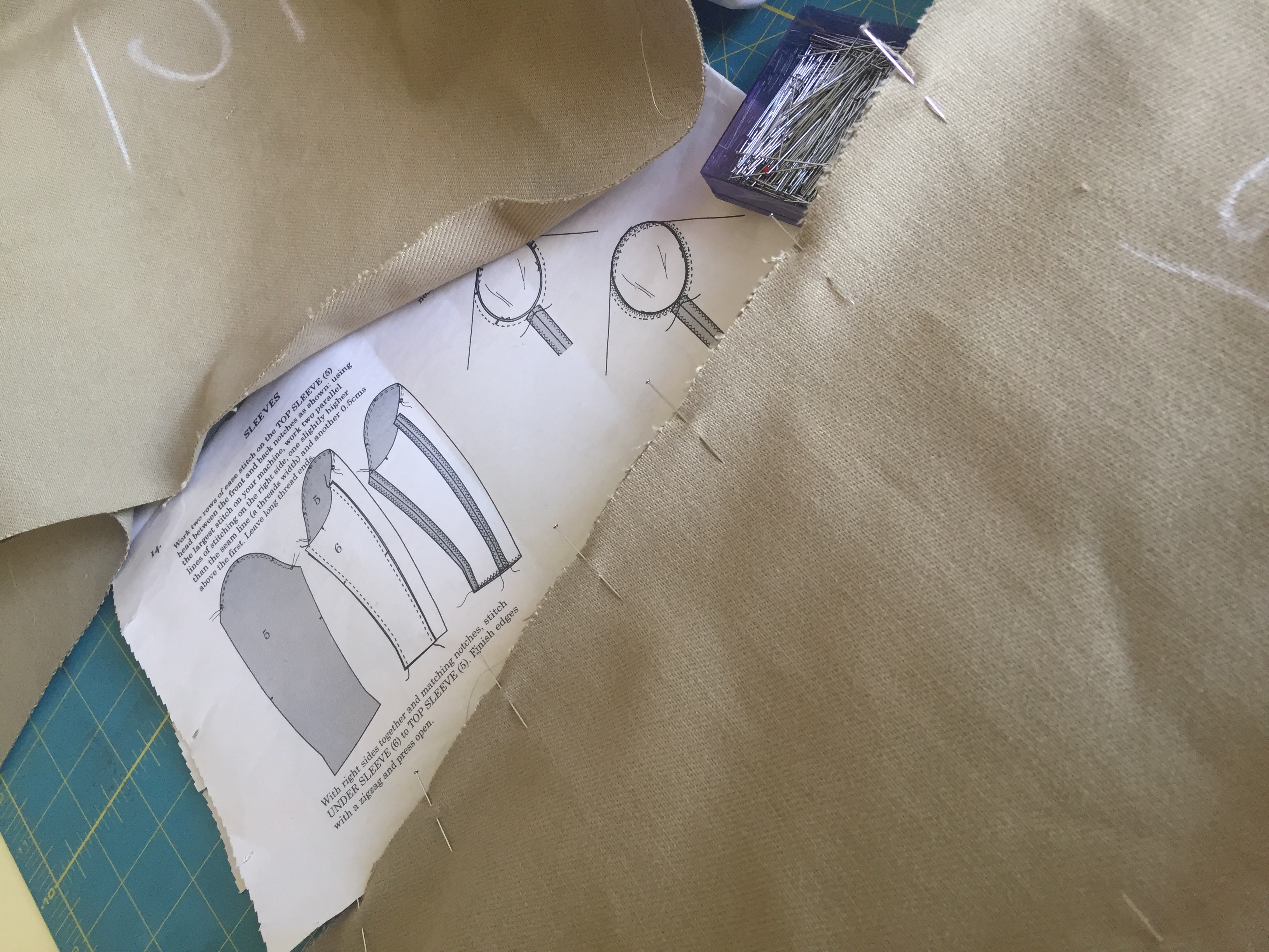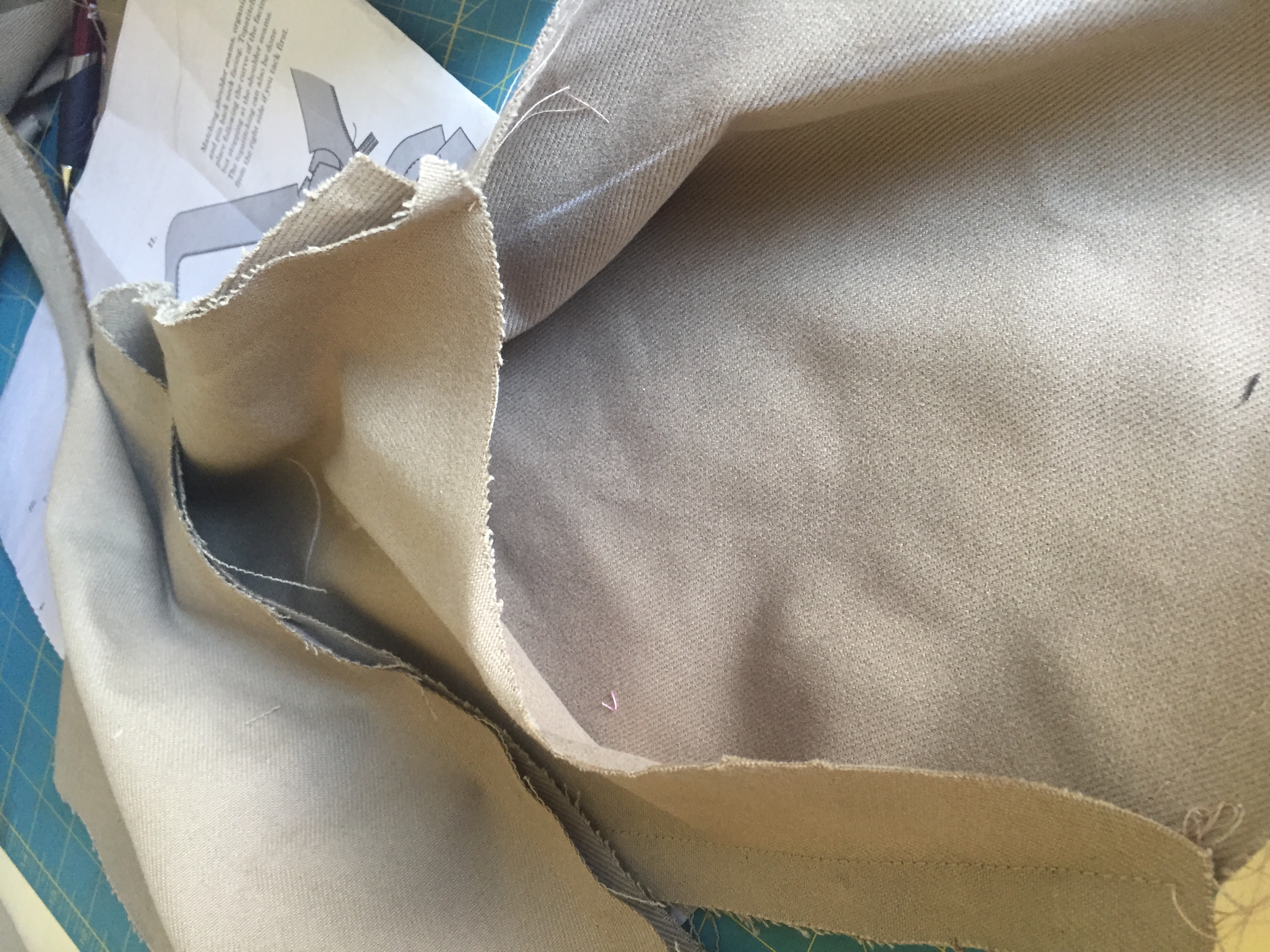 Arms assembled it’s step 15, setting in the sleeves. This was another one where the description of the task is trickier than the actual job, and also a point where if you weren’t paying attention right at the start, you have to look back and redo a little. When you originally marked out the pieces for cutting, there were a number of “notches” on the paper pattern. I think the intention is to actually cut these in the fabric, though I’ve had more luck just marking them with a pen (less fraying, more happiness). In any case, I hadn’t noticed these notches and hence not marked them onto the arm pieces or the front and back body pieces. So out with the pattern again, orient the pieces the right way and mark the backside. The notches are important as there are 4 markings on each piece to ensure the arms sit right.