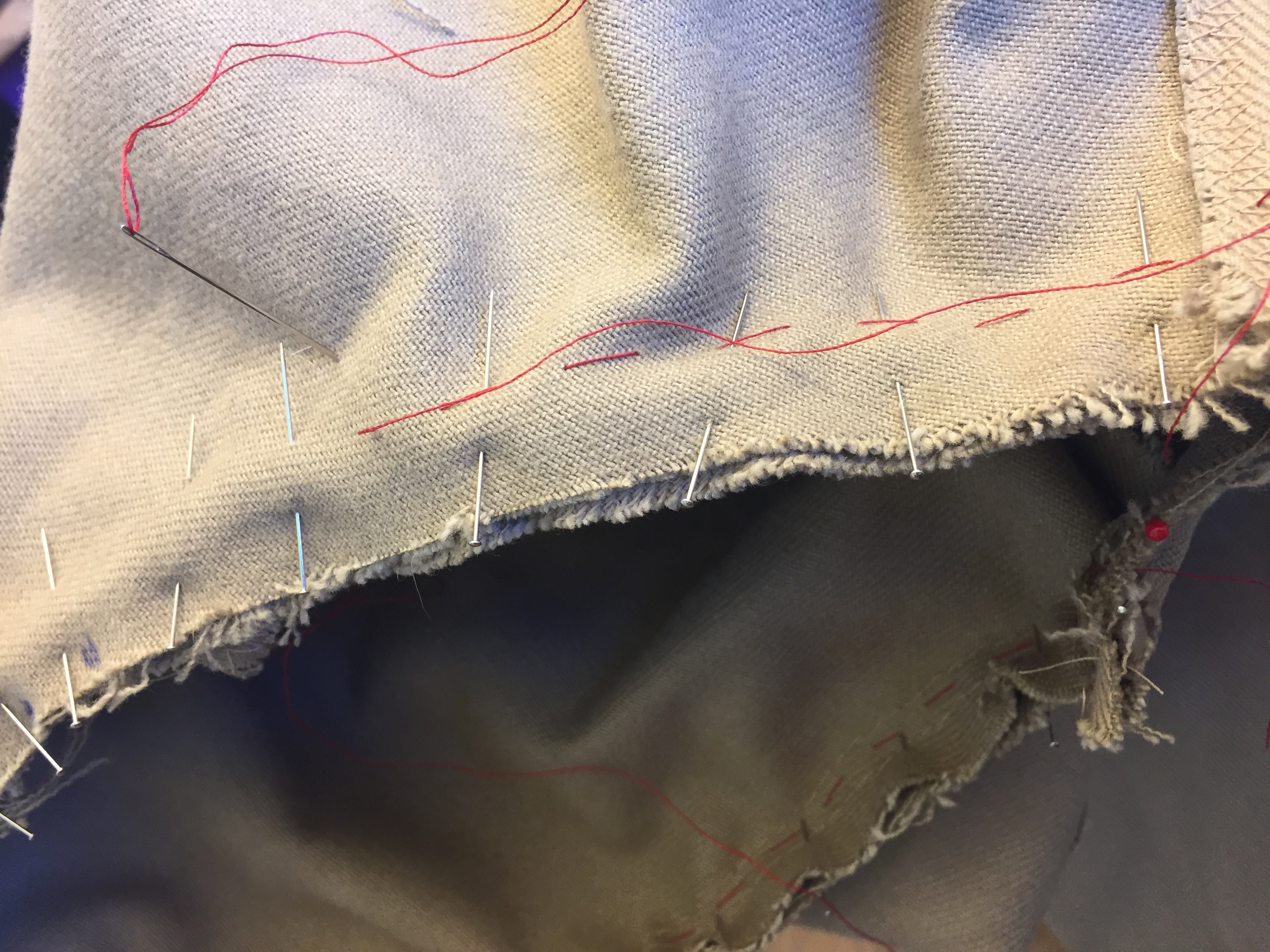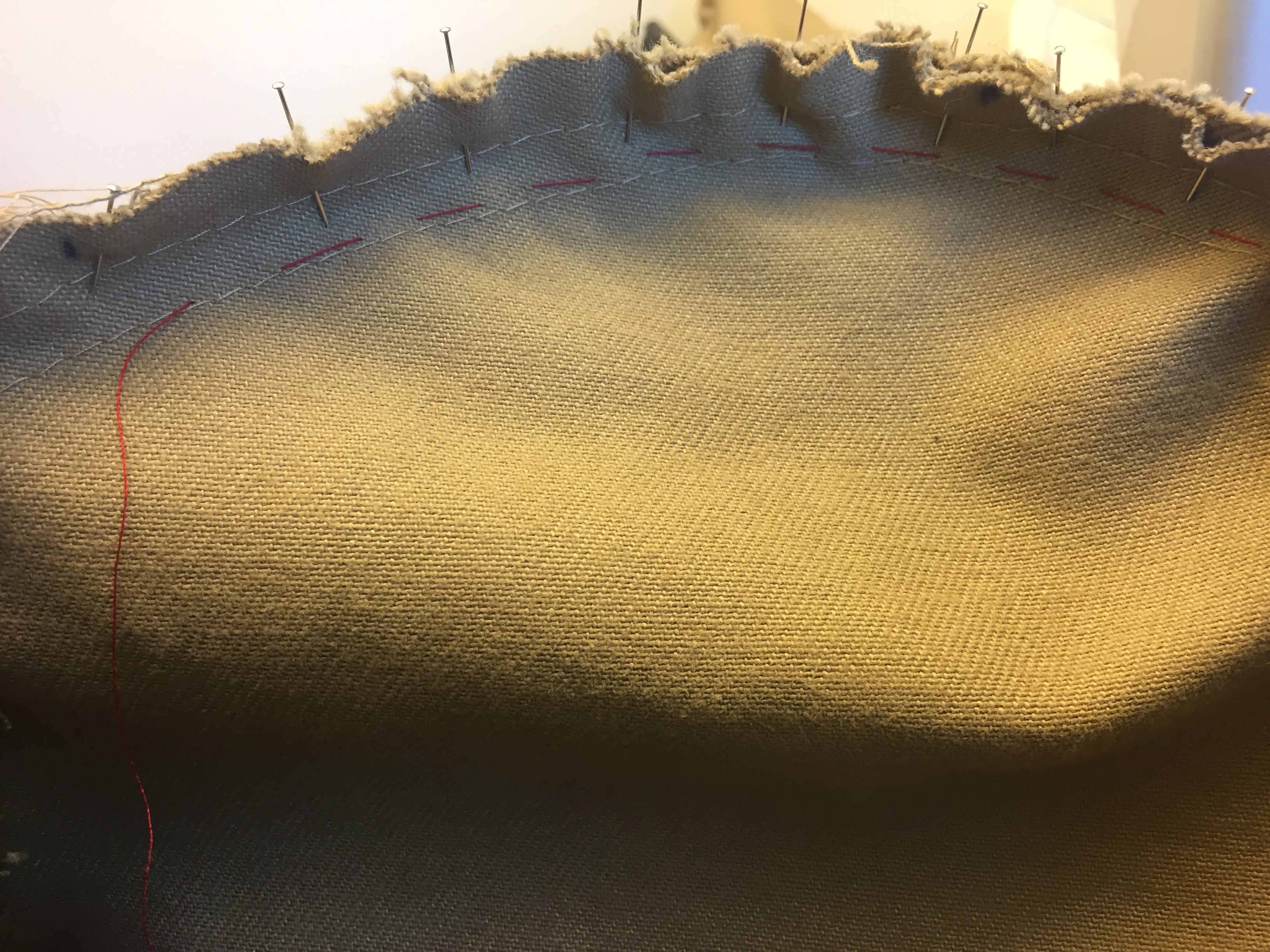 In fact, the hand stitching became useful for the next step as well, as after placing lots and lots of pins round the edge to be sewn, it became obvious that with the bulk of the pieces and pins poking everywhere, it was pretty hazardous to manoeuvre it all into the sewing machine, let alone sew around the edge with any elegance. Not only that, but at some points the fabric is layered three deep and the machine was struggling to work it’s way over all the pins. So I spent a few minutes basting (wow, I sound properly Savile Row now) the edge, as in with a needle and thread I quickly stitched along the edge. Cleverly, using a contrasting thread and doing this along the seam allowance, I also had a nice and visible marking to sew along once I’d removed all the pins!