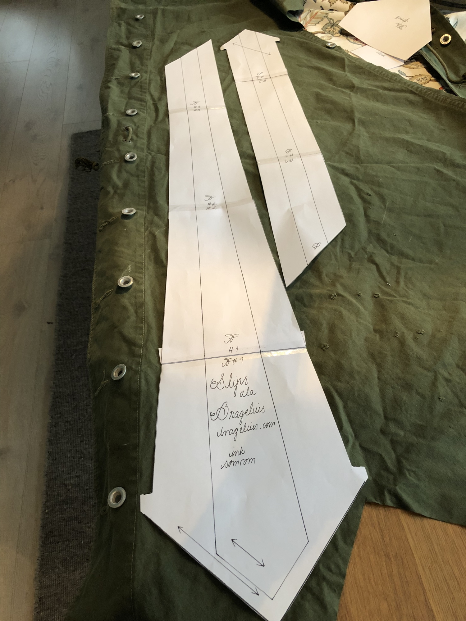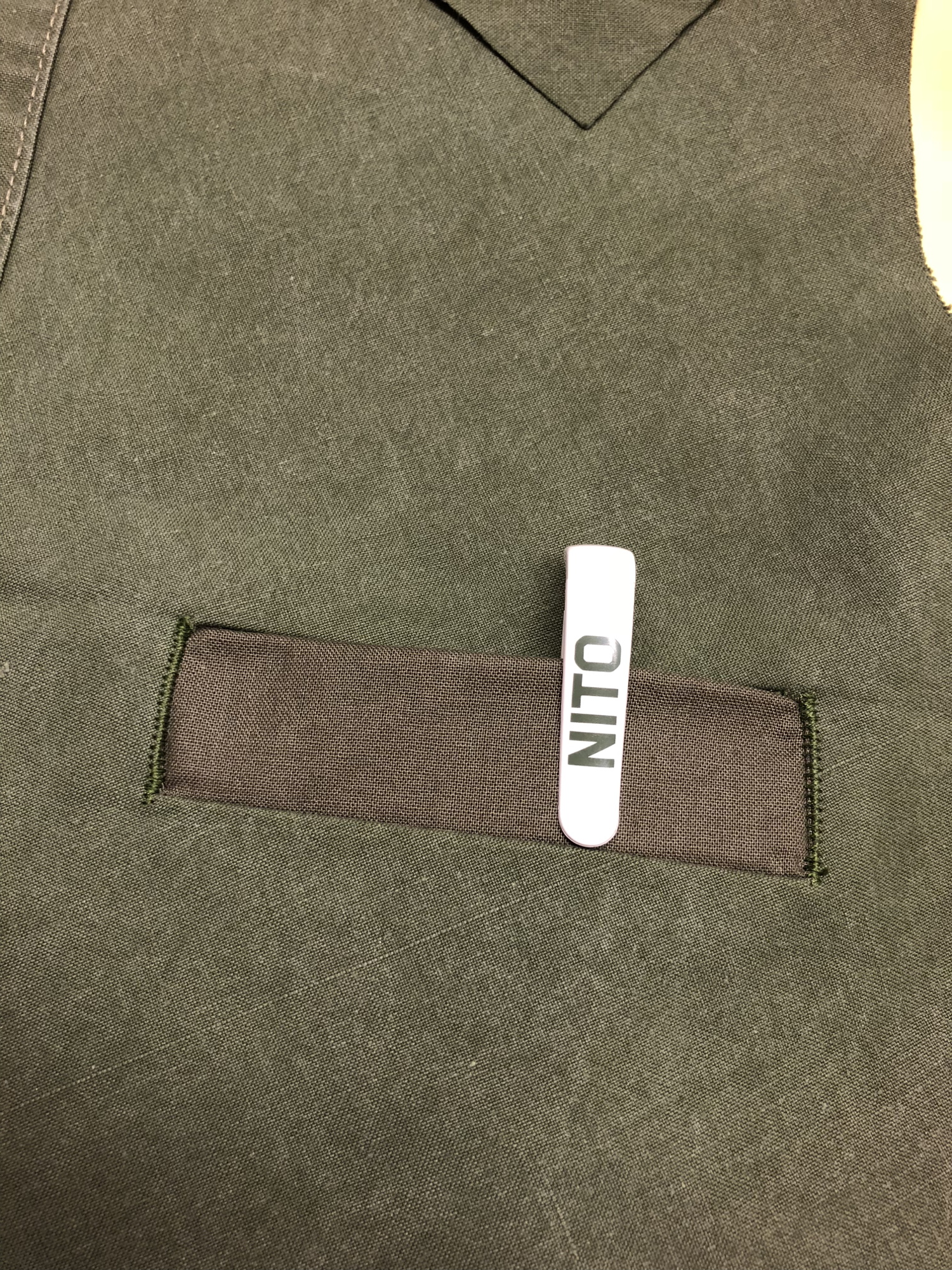 I’m a big fan of Maharishi’s “Pacifist Military Design” theme. Maharishi makes lots of stuff I can’t understand, but repurposing army gear for pacifism rings true to me. Now I could have just made a simple waistcoat that might actually look like an army issued waistcoat, so it needed some extra features to demilitarise it. Hence full lapel and collar, and four functional double-welted pockets. If you’re wondering which pattern I’ve used, it’s one I’ve been working on for my own use, with bits copied from here and there. The advantage of this is that I know how it goes together and I know it’ll pretty much fit. Hence all the various bits have been transferred to old sheets to make the cutting of parts quick and efficient. Those flimsy pieces of paper are a nightmare to mess around with.