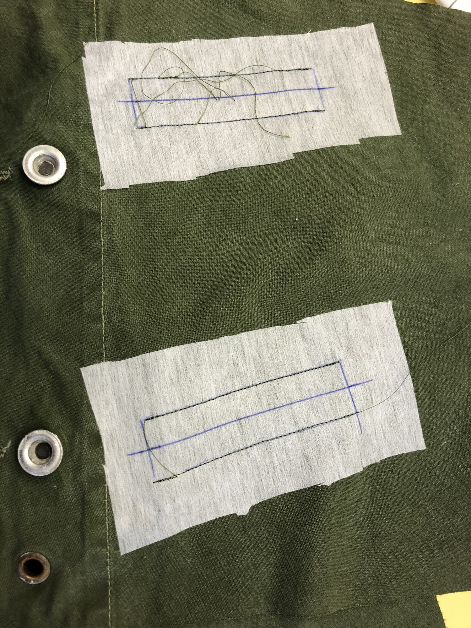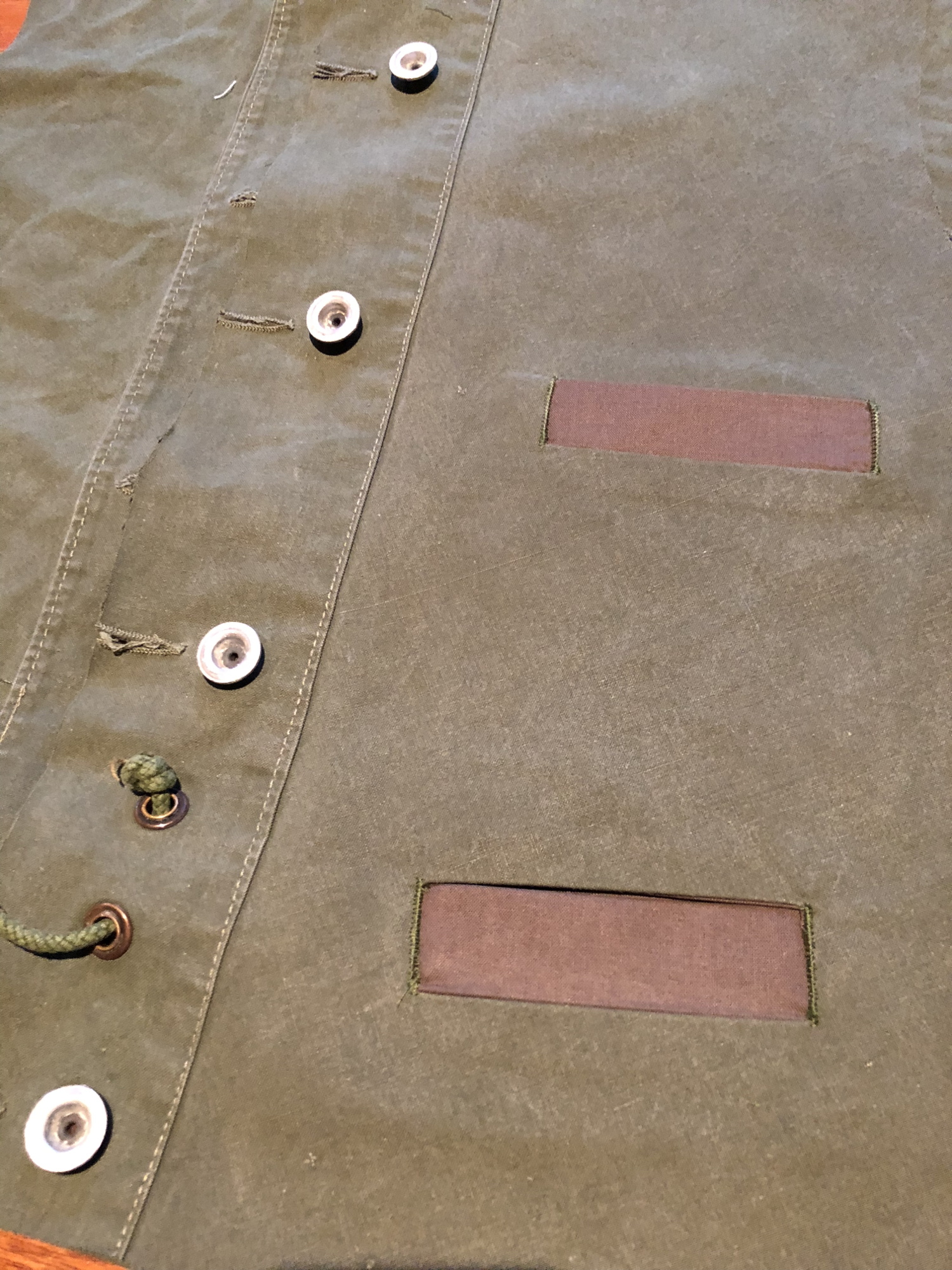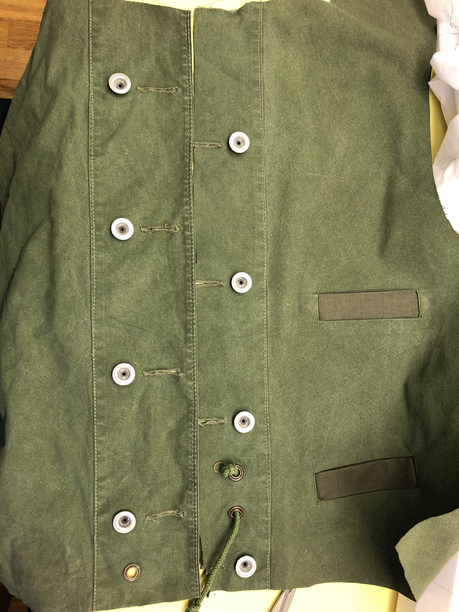 - After cutting a new left hand side, with everything aligned, I could proceed. Notice new pocket welts in tent fabric instead of lining. Starting to look like a waistcoat!