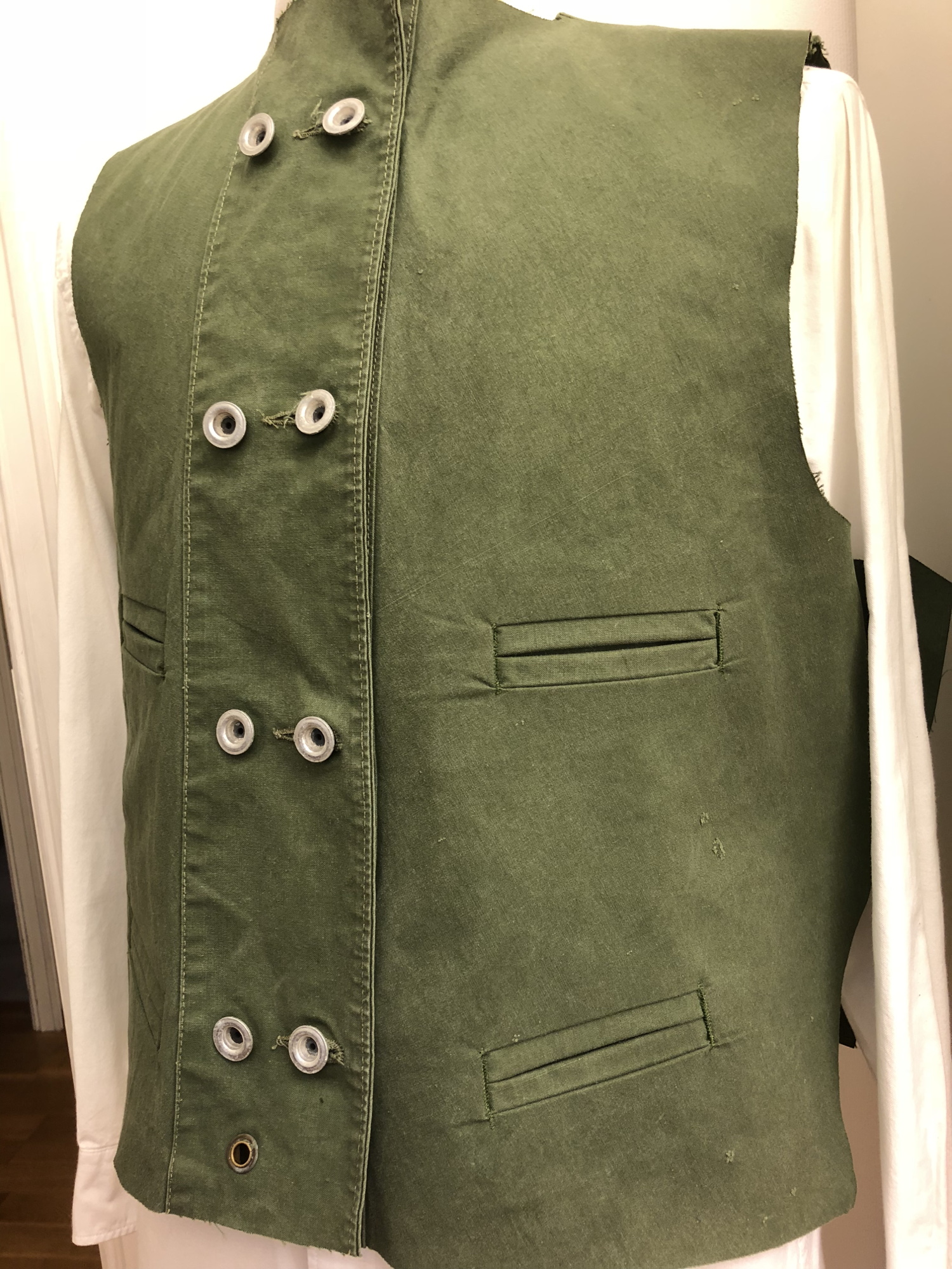 The starting point of my design though was to reuse the buttons and buttonholes. Party because that saves the time needed to actually make holes and attach buttons, yet mostly because I’ve never seen a waistcoat anywhere close to doing this. Kind of a double-breasted look with super-utilitarian aluminium buttons riveted together. Actually, those rivets caused problems, as from a sewing perspective it would have been really handy to have been able to remove the buttons while working on it. My efforts to drill out the rivets were met with resounding failure though, so I had to work around them. Cutting out all the pieces was easy though, a pleasant fabric to work with, and surprisingly it took to being steam pressed very well.