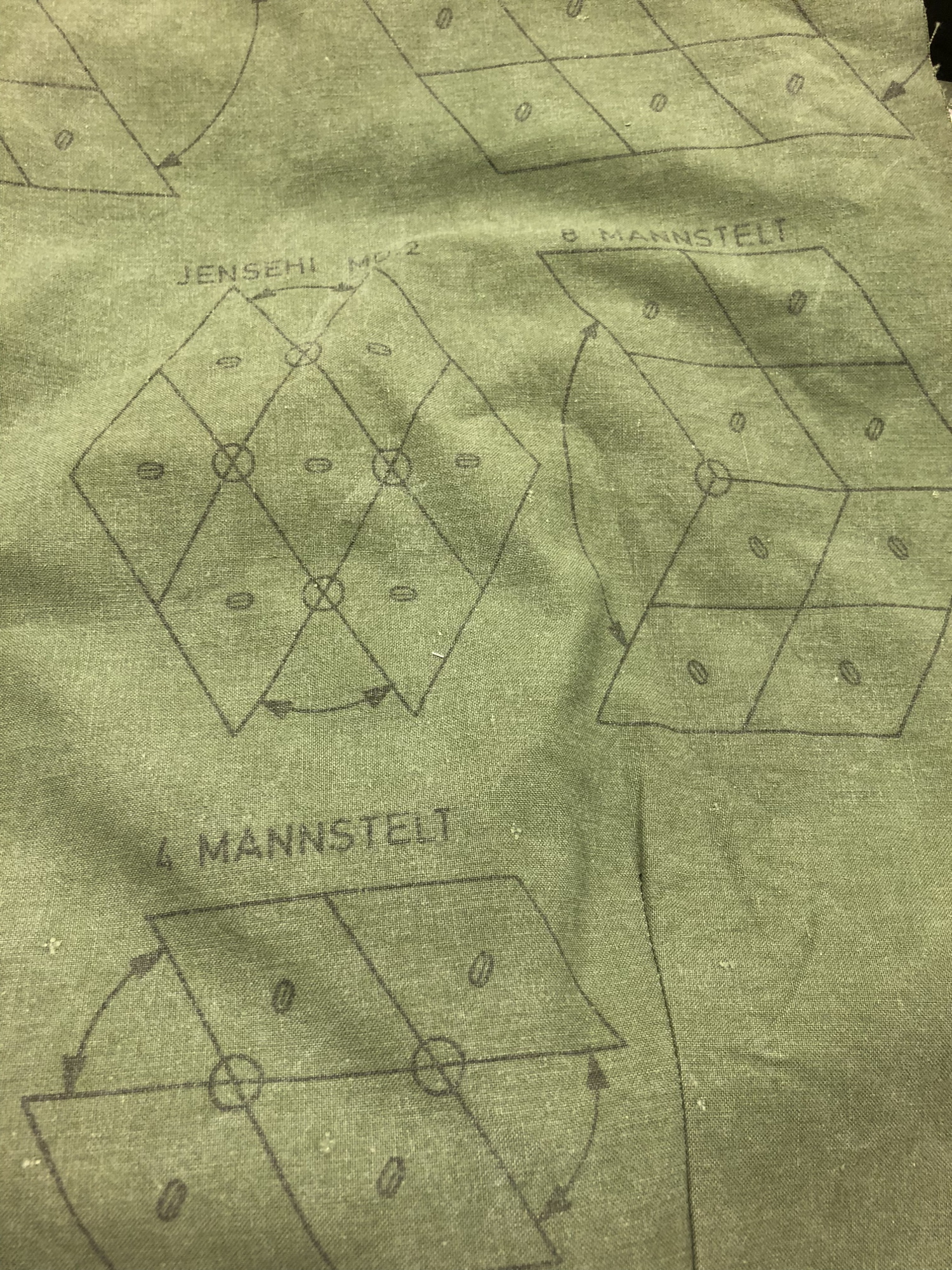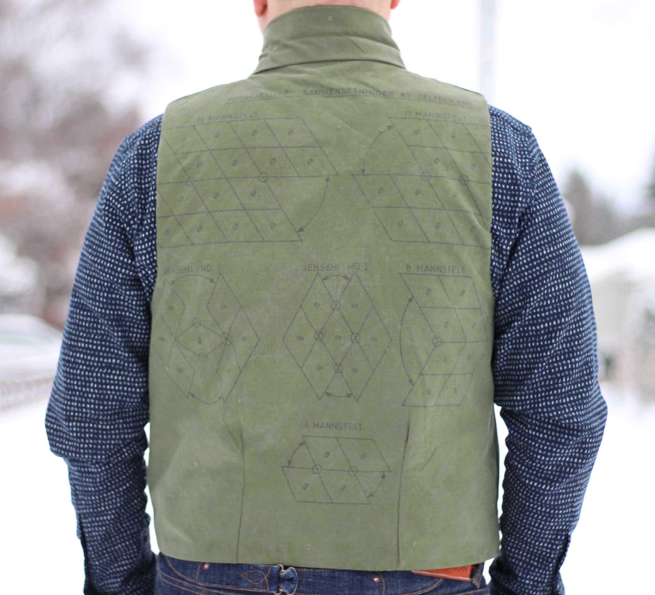 Inspiration can come from odd places though, like when I found a vintage Norwegian army tent at a thrift sale. Army tents have been re-purposed before, as in the case of the Monitaly parka, but looking at this fairly sizeable piece of green fabric, with all the buttons and buttonholes, did get me thinking. It’s an odd design to start with, being lozenge-shaped with a hole in the middle. Very much a dual-purpose and clever piece of engineering, as you can wear it as a poncho, use it as a tent, or if you have a number of homies with their own pieces, button it together and make a multi-person tent. And handily the instructions for this are printed on the tent fabric.