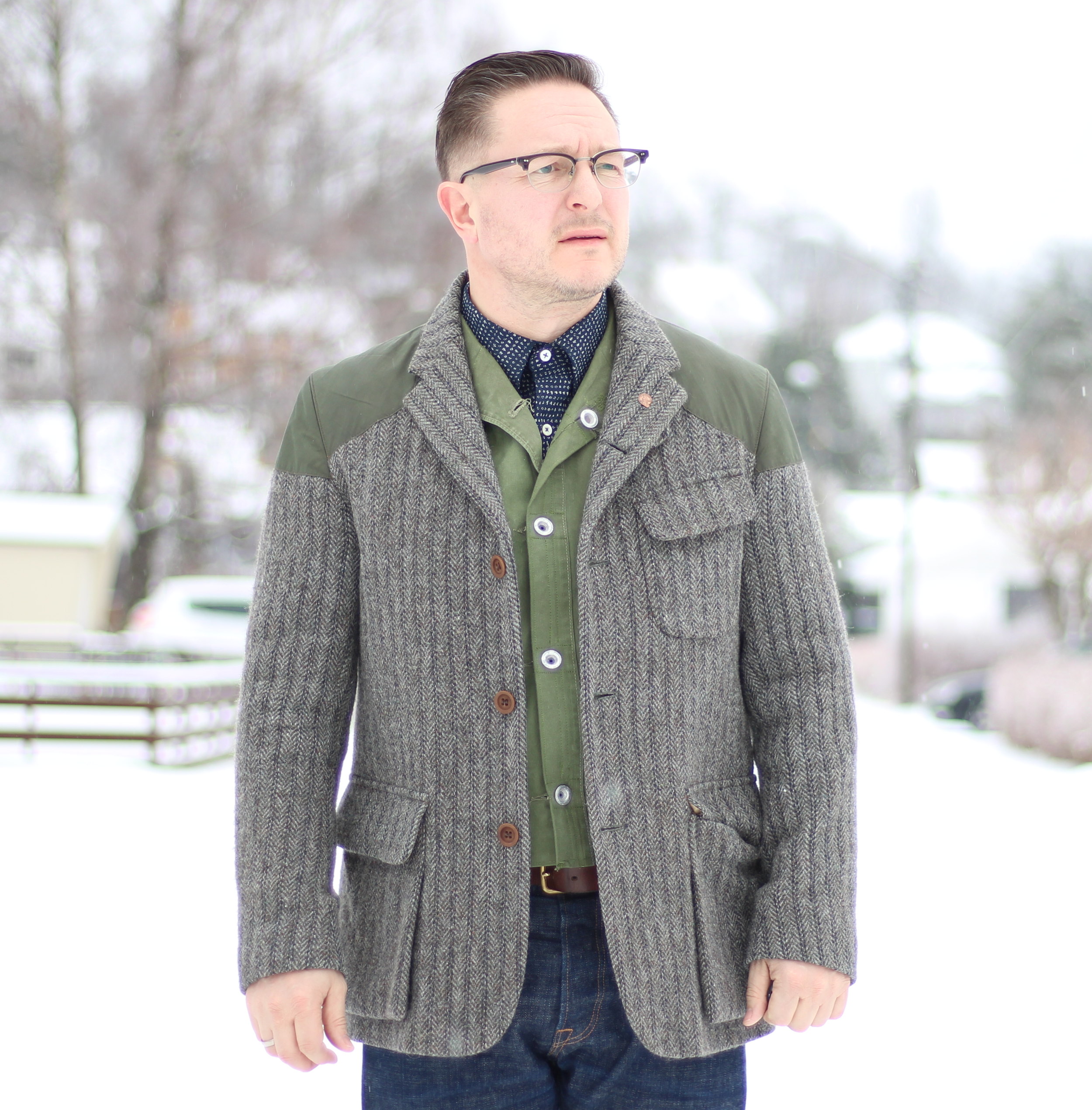 - Worn with full open lapel with Harris tweed.