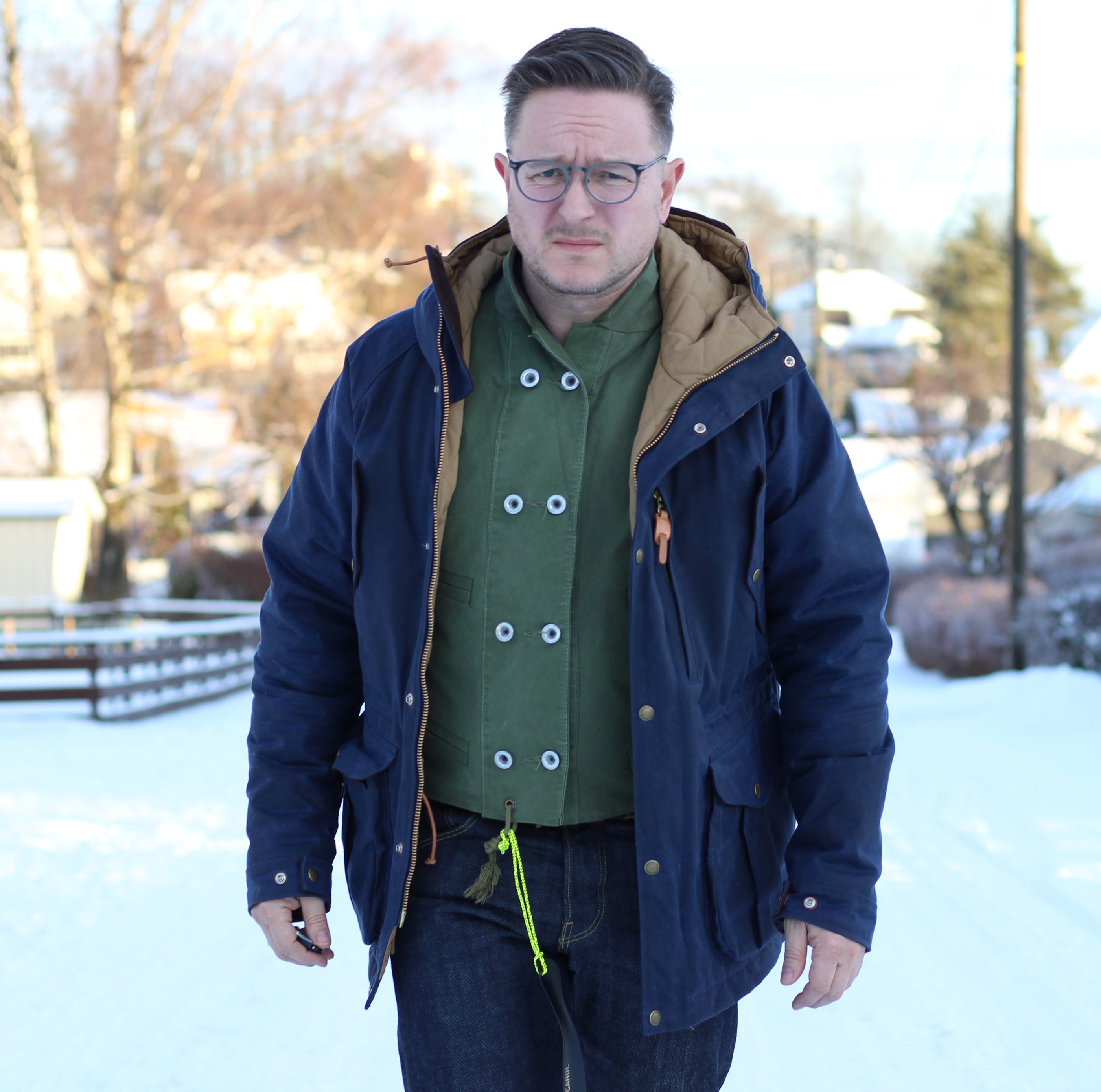 - Worn fully buttoned up with mountain parka.