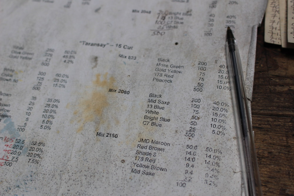 The dyeing process happens in large cauldron-like containers. And this was where I experienced something of a revelation. You know how there’s always talk of the earthy, natural colours of tweed? How it reflects the hues and tones of the nature of the Hebrides? I’ll admit I hadn’t thought it quite through, but I was expecting them to be dyeing the wool in these colours, so when I saw this on the wall I was more than a little curious: