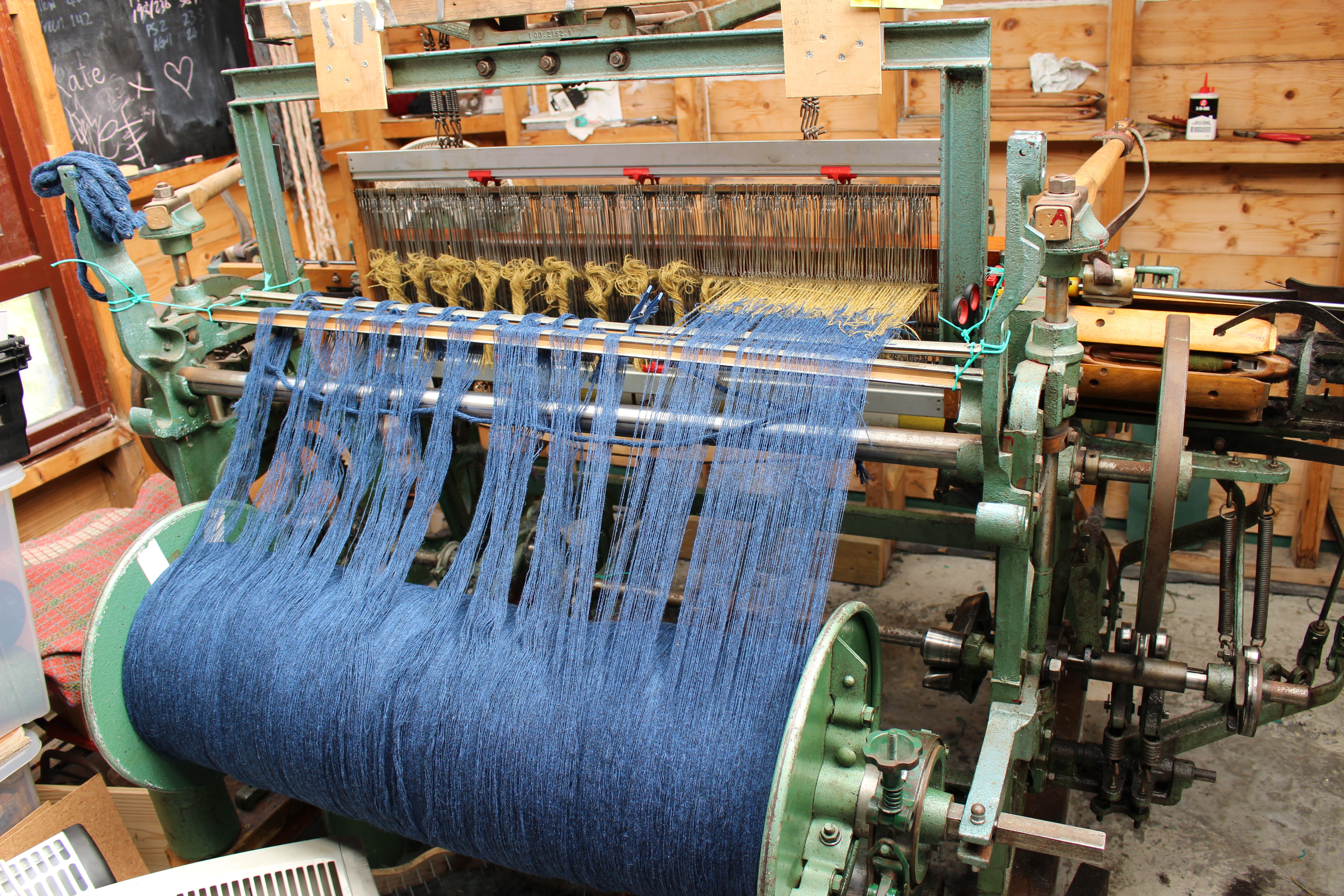 The business side of a Mk2 Hattersley loom, mid weaving. Blink and you’d miss the shuttle being whacked across from side to side!